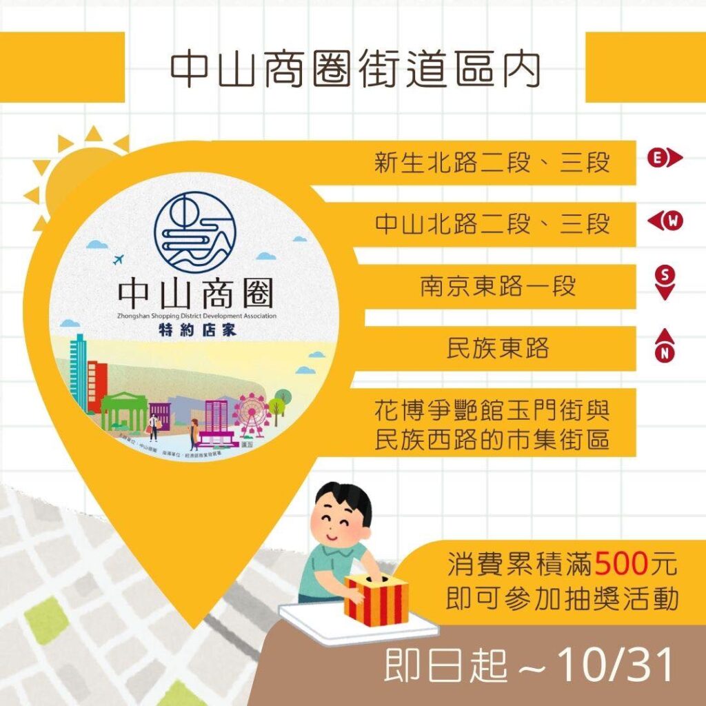 9/1~10/31只要在中山商圈街區內任何店家消費累積滿500元,上網登錄發票即可參加抽獎。