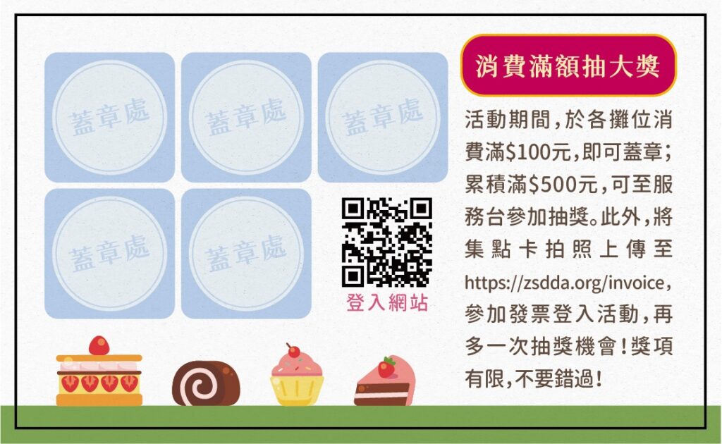 10/5㊅~10/6㊐ 市集活動現場,於各攤位消費滿$100元,即可蓋章;累積滿$500元,可至服務台參加抽獎。此外,將集點卡拍照上傳,可參加發票登入活動,再多一次抽獎機會!獎項有限,不要錯過!