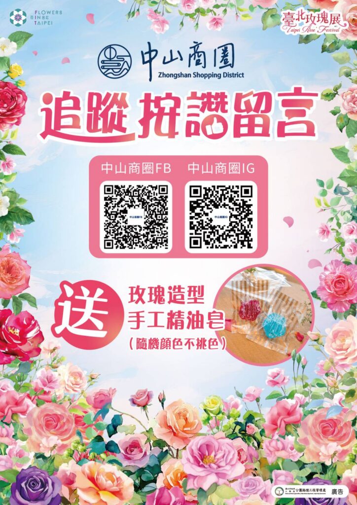 市集活動 Market2026台北玫瑰展|打卡送玫瑰造型手工精油皂 Posted on 2026-03-062026-03-08 by zsdda 中山商圈 2026台北玫瑰展|低碳漫遊集點趣 2026台北玫瑰展|中山商圈手作DIY
