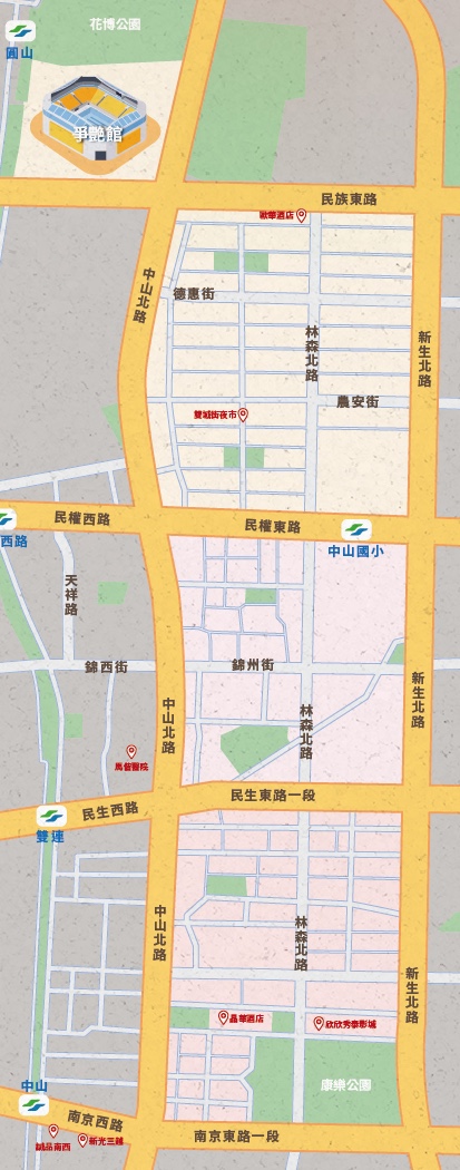 從臺北城外沿著中山北路,一路走到圓山花博公園,匯聚「山」、「水」、「綠意」、「文化」與「產業」風華。這裡是中山商圈,是臺北的精緻休閒廊帶,代表著這座大都會的繁榮,也勾起旅客們的美好記憶。