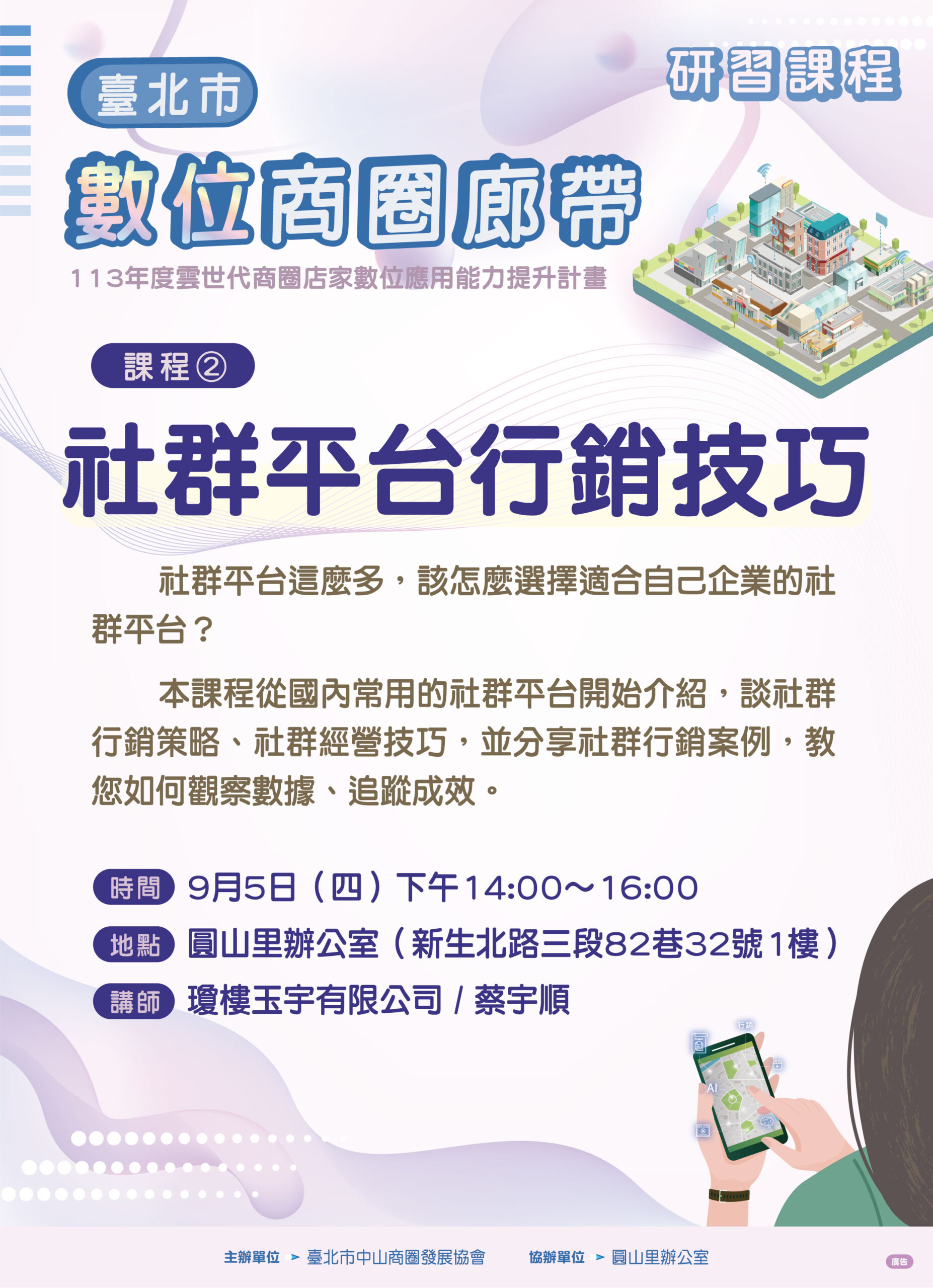 學習課程 Course【數位商圈廊帶】社群平台行銷技巧 Posted on 2024-08-302025-06-19 by zsdda 中山商圈 社群平台這麼多,該怎麼選擇適合自己企業的社群平台?本課程從國內常用的社群平台開始介紹,談社群行銷策略、社群經營技巧,並分享社群行銷案例,教您如何觀察數據、追蹤成效。 時間:9月5日(四)下午14:00~16:00 地點:圓山里辦公室(新生北路三段82巷32號1樓) 講師:瓊樓玉宇有限公司 / 蔡宇順 臺北市數位商圈廊帶 城北:中山商圈、條通商圈、西湖商圈 城中:台北城中商圈、榮町商圈、沅陵商圈 城南:艋舺夜市商圈、華西夜市商圈、萬華街區發展協會、艋舺服務商圈 【數位商圈廊帶】短影音行銷技巧 【數位商圈廊帶】數位研習課程