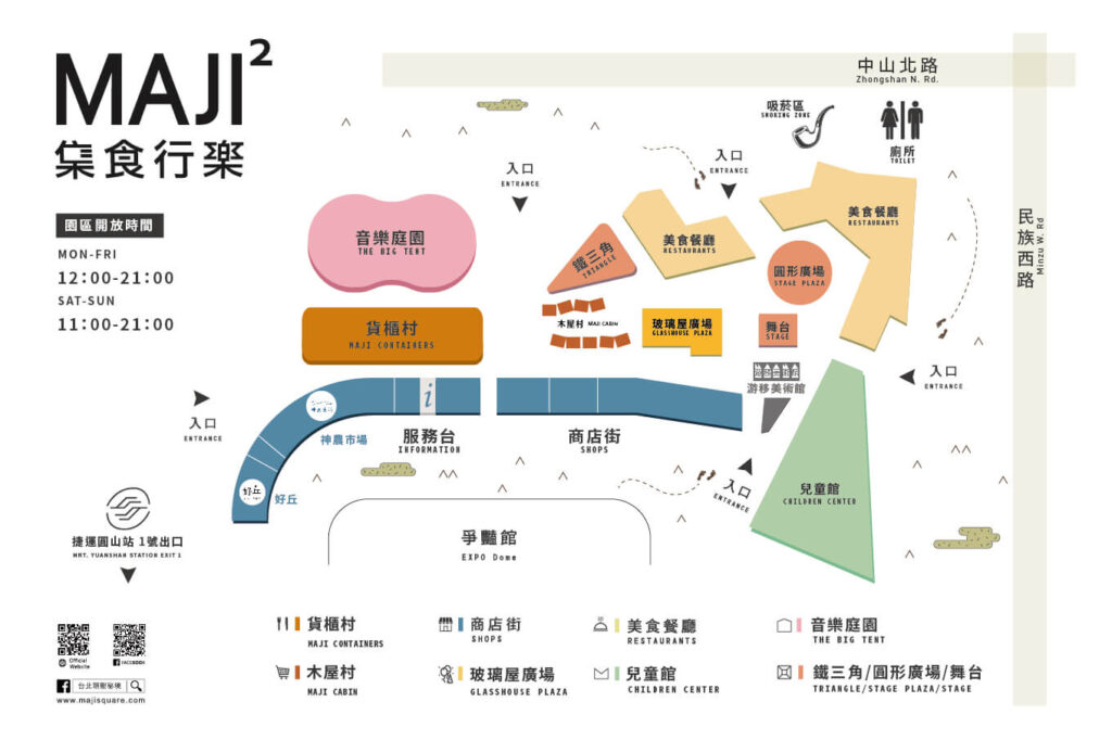 「MAJI MAJI 集食行樂」隱身在台北花博園區一角,2013年6月正式營運。由歌手哈林庾澄慶與知名設計師葉裕清精心規劃,在大自然中運用貨櫃、原木穀倉,巧妙包覆住美食、原創商品、音樂、藝術等元素,打造出具有異國氛圍的生活市集空間:一座城市遊樂園。MAJI 集食行樂包含六大區域:神農市場、寰宇小吃街、玻璃屋市集、異國美食餐廳、商店街、Triangle以及多功能展演空間。
