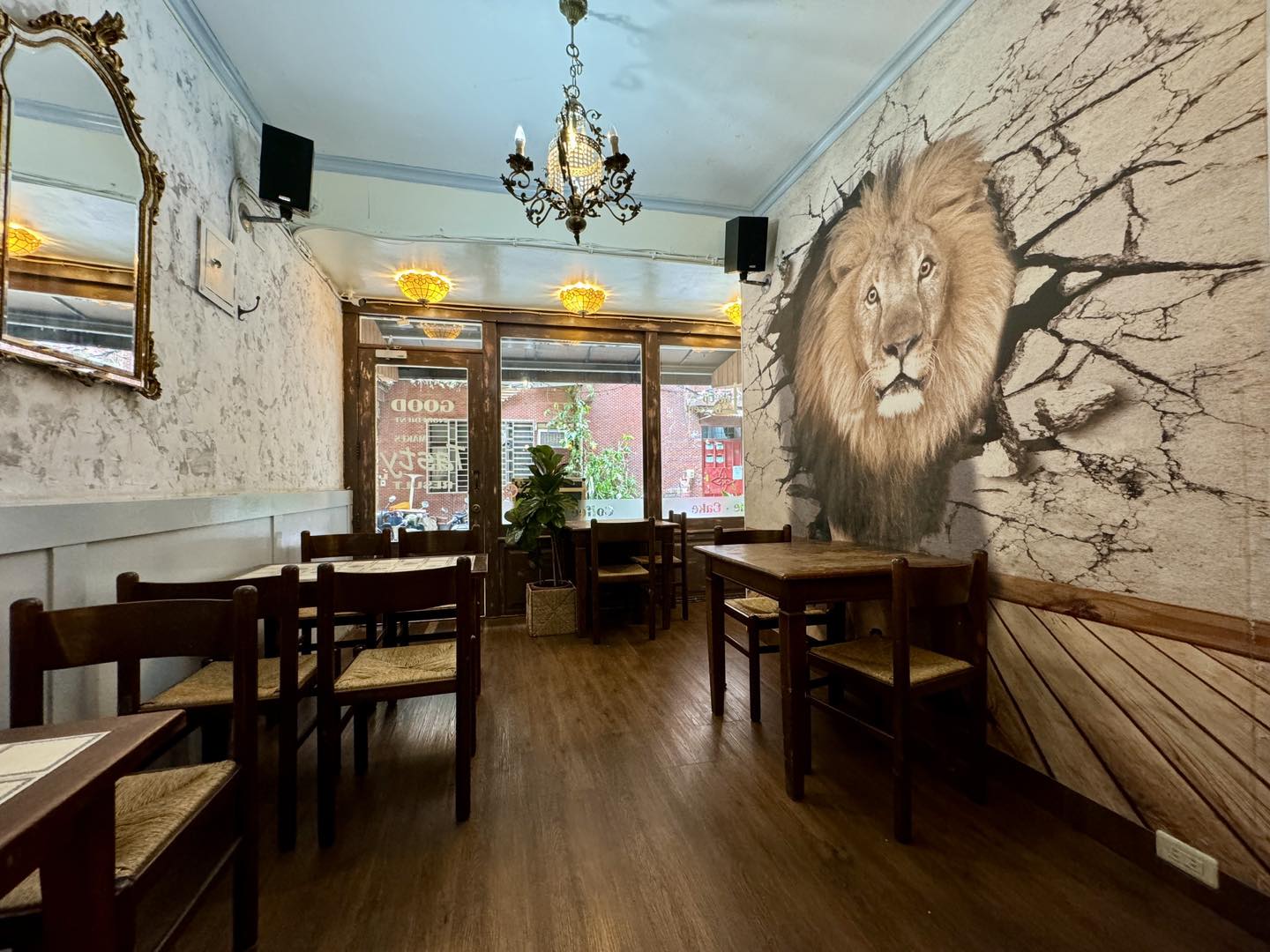 推開鵝黃色的玻璃門,左手邊的一面大牆上畫著一頭大獅子破牆而出。沒錯,那就是獅子甜點的意象。用肉眼看只是平面圖而已,但是用手機拍可以拍出3D的立體感。