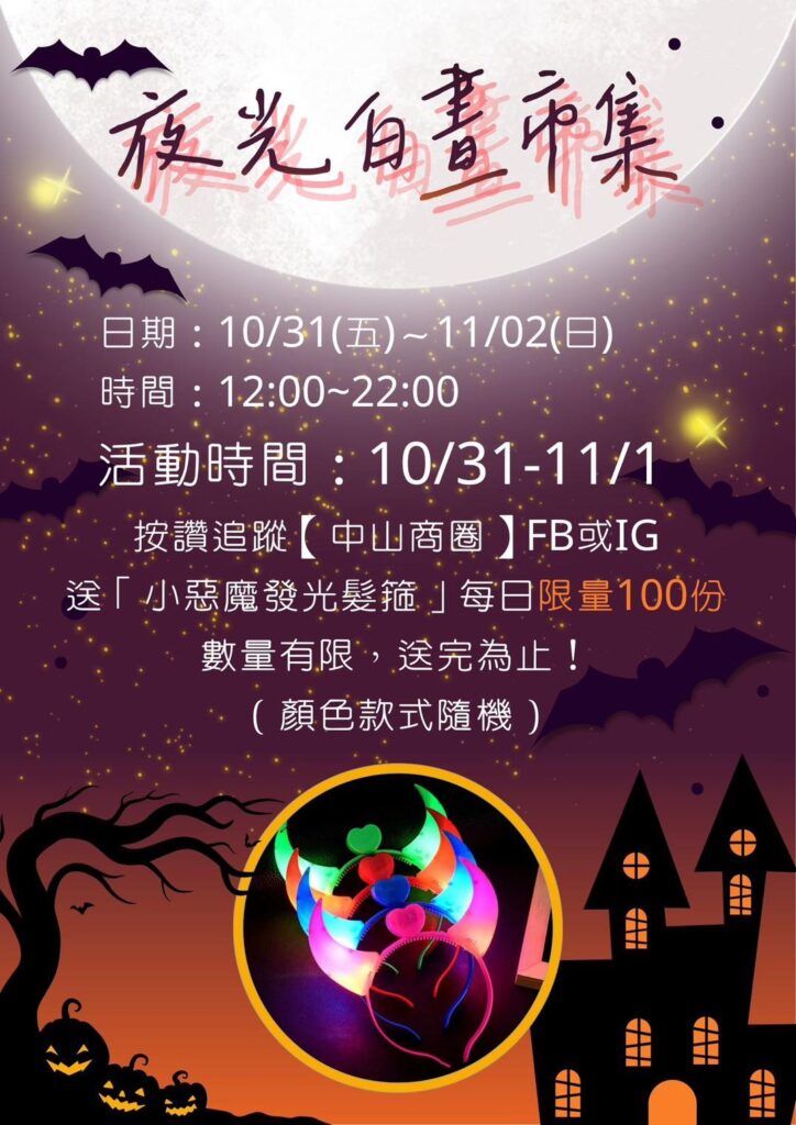 10/31(五)~11/1(六)只要在市集現場追蹤並按讚「中山商圈發展協會」FB或IG,即可獲得「小惡魔發光髮箍」乙個!
