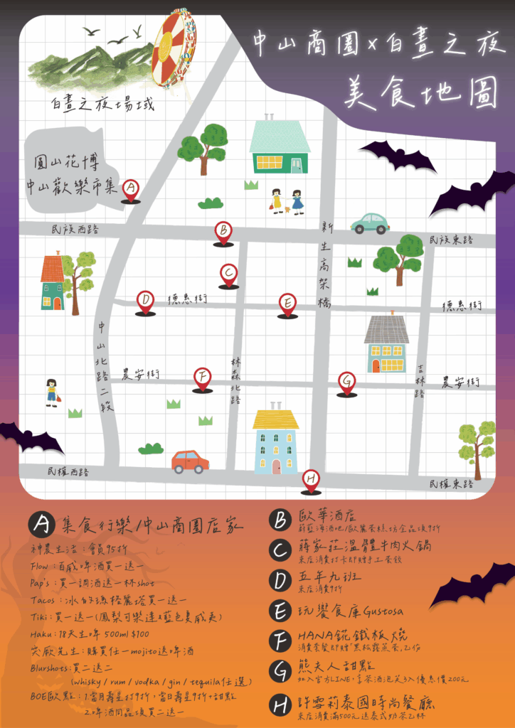 | Pap’ s Street Bar | 即日起至11/2,購買一杯調酒送一杯shot。 | MAJI集食行樂(臺北市中山區玉門街1號) | 02 2597 7112 |